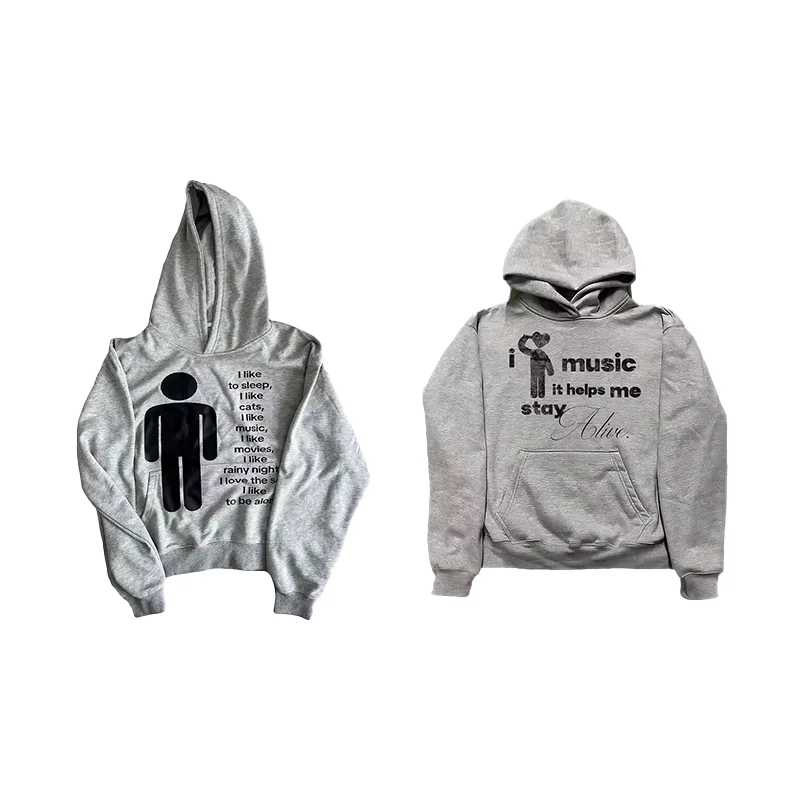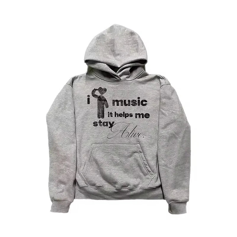 Music Graphic Inspirational Quote Printing Gray Long Sleeve Pullover Hooded Sweatshirt Y2K Men Women Fashion Casual Streetwear