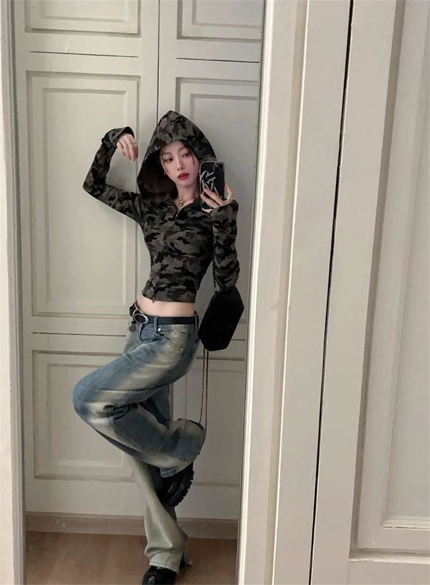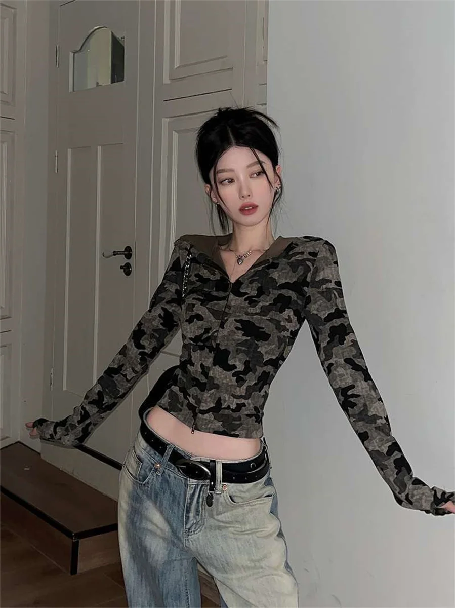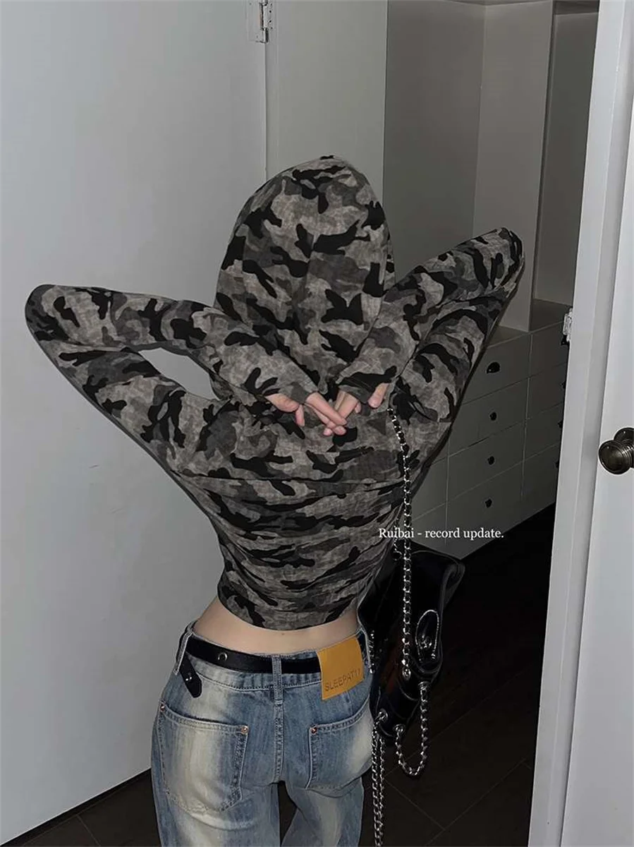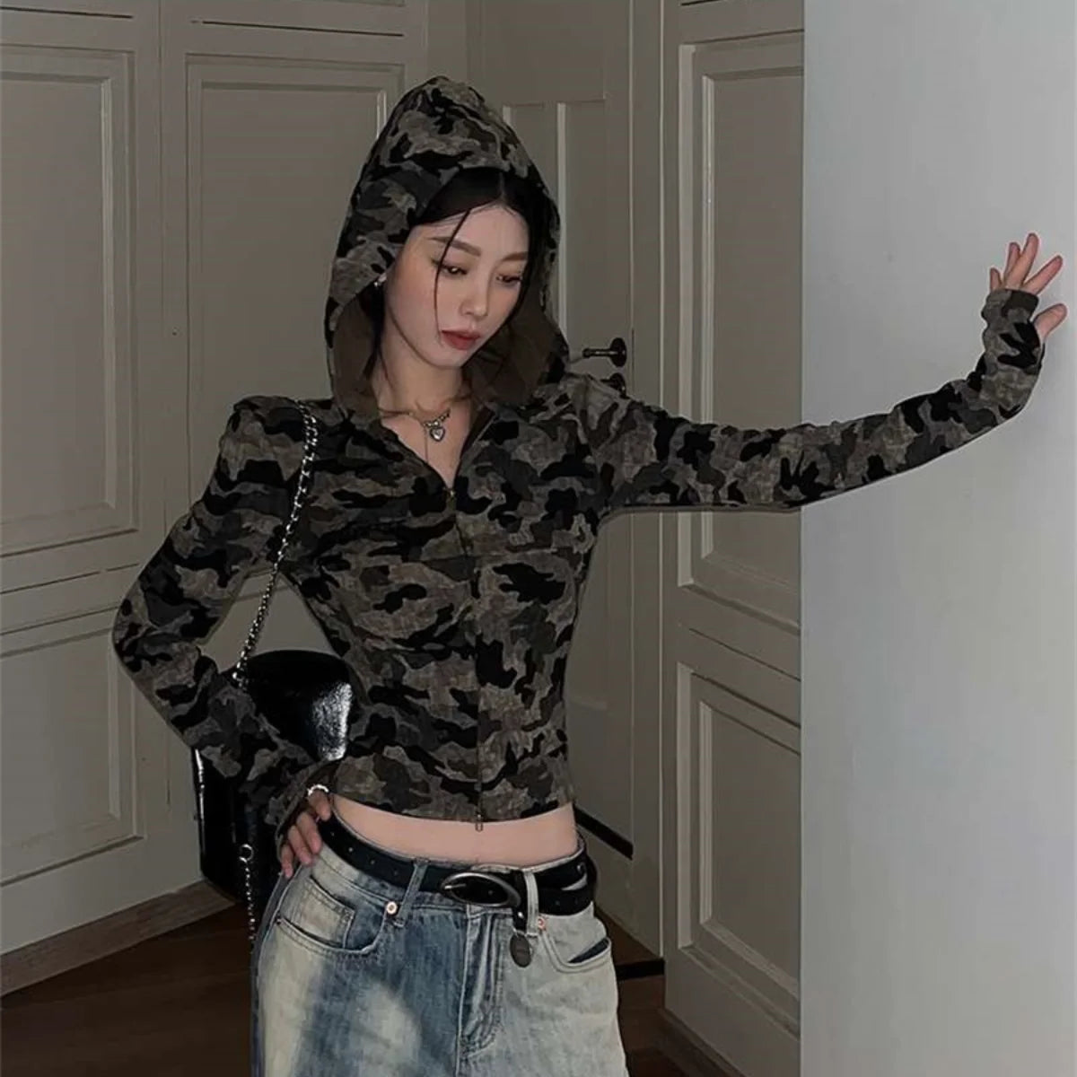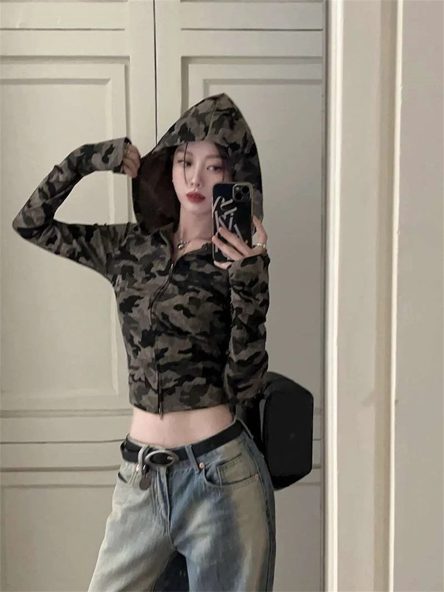 Retro Camo Streetwear Skinny Hooded T-shirts For Women Korean Fashion Camouflage Zipper Up Cropped Tops Chic Autumn Tee Shirts